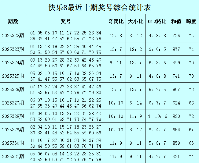 福彩风景8第2025331期开出奖号:05 06 07 08 14 18 22 23 25 31 40 52 59 63 71 72 73 76 77 79,其中奖号奇偶比开出11:9,大小比开出9:11,和值开出821,跨度开出74,012路比开出4:9:7。
