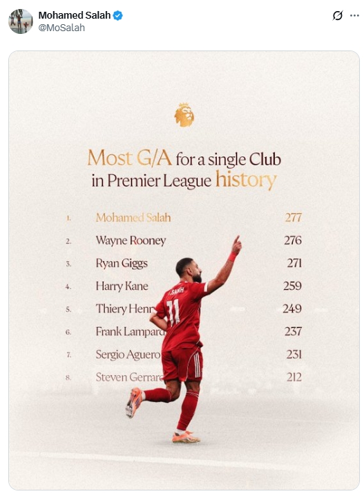 直播吧12月15日讯 当天萨拉赫更新社媒,晒出了英超历史单一俱乐部参与进球榜,并未配上翰墨。在周末对阵布莱顿的比赛中助攻后,萨拉赫以277球高出鲁尼独占第一。当今萨拉赫仍是离开利物浦备战非洲杯。