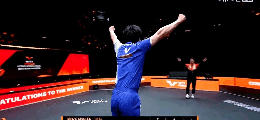 比如,张本智和在决赛锁定冠军时,效法了中国名将樊振东的庆祝动作——把拍子放在地上,双手指向太空。