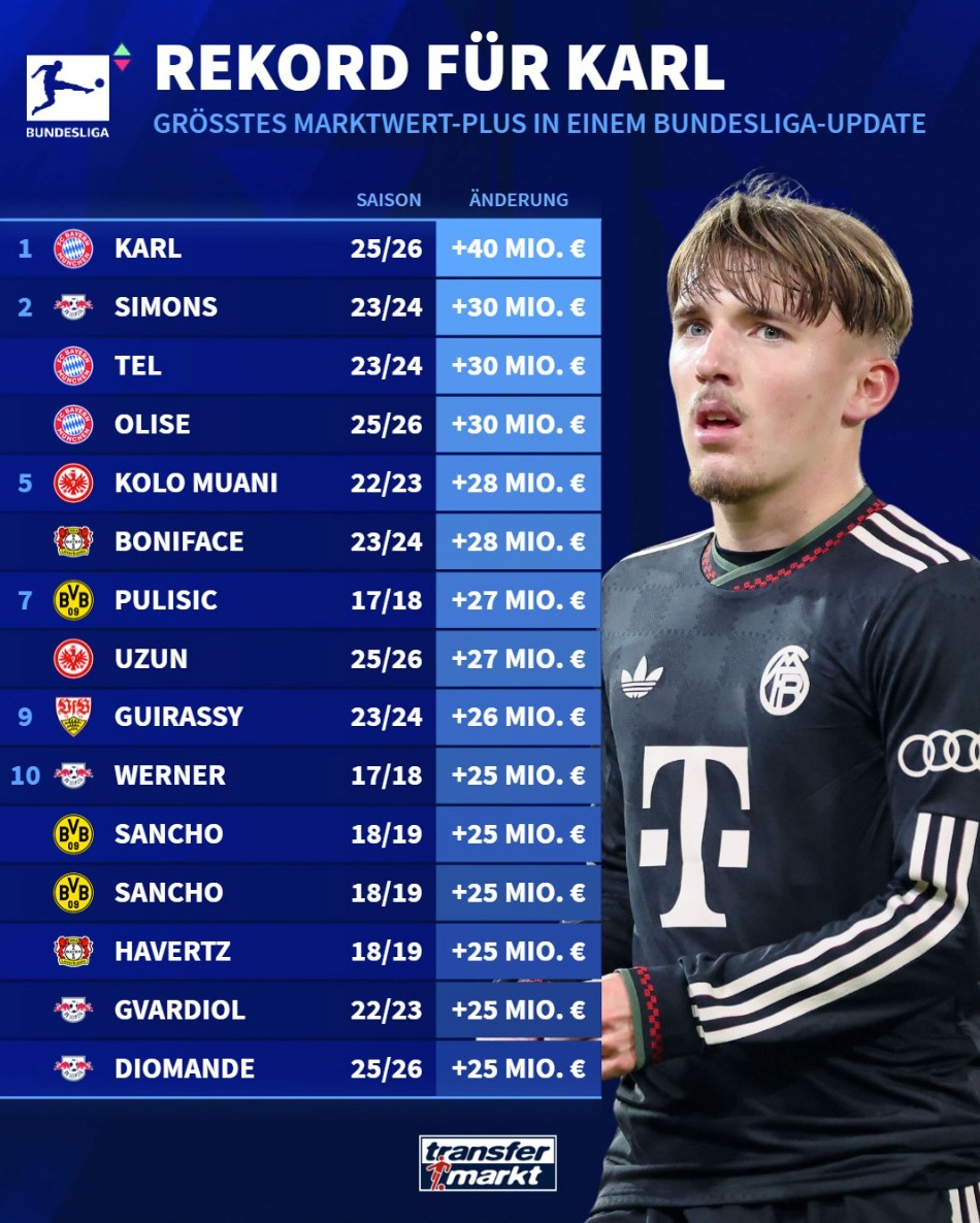 1. 伦纳特-卡尔(拜仁慕尼黑) 25-26赛季 +4000万欧元
