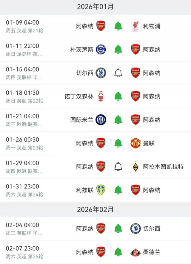 从当今启动到 2 月 7 日,阿森纳在往日 34 天还要踢整整 10 场比赛,平均 3.4 天一场比赛,也便是说每周都是一周双赛,其中包括 5 场英超、2 场欧冠、2 场英联杯半决赛和 1 场足总杯第 3 轮的比赛。10 个敌手循序是利物浦(主)、朴茨茅斯(客)、切尔西(客)、诺丁汉丛林(客)、国米(客)、曼联(主)、阿拉木图凯拉特(主)、利兹联(客)、切尔西(主)和桑德兰(主),天然是 5 主 5 客,但其中包括了足总杯、英联杯、英超和欧冠的四连客。10 个敌手中实力较着低于阿森纳的是朴茨茅斯、诺丁汉丛林、阿拉木图凯拉特、利兹联和桑德兰,另外 4 个敌手利物浦、切尔西(两回合)、国米和曼联都有豪阔实力给阿森纳带来贫苦。