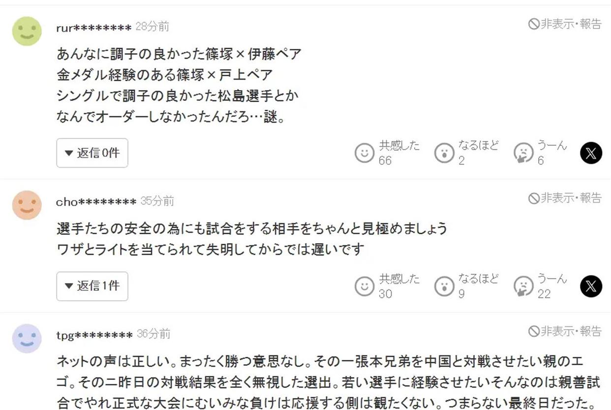 日本球迷这下炸了锅。有东谈主盯着混双组合松岛辉空和大藤沙月不放,说两东谈主场上没相似,协作跟生分东谈主似的,打得蔫头耷脑没情谊。还有东谈主把锋芒瞄准张本智和兄妹,质疑磨真金不怕火组不该让他们上单打,“你看东谈主家中国队员,眼睛里皆冒着火,他们倒像来旅游的”。这话听着耳熟,或者每次输球皆能听到雷同的烦恼。