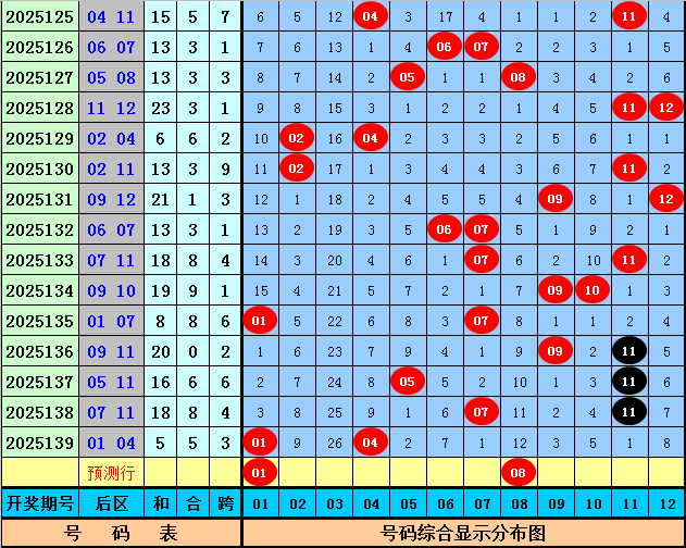 后区号码分析:上期后区开出奖号01 04,和值为5,跨度为3,本期后区参考号码01、03、04、05、08。