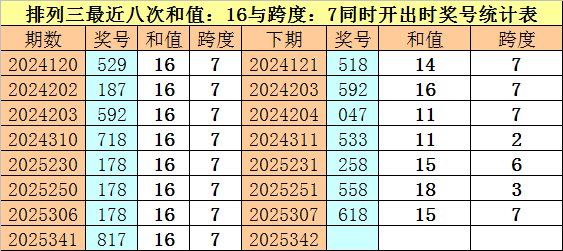 开奖归来:体彩胪列三第2025341期奖号为:817。和值为:16,跨度为:7。
