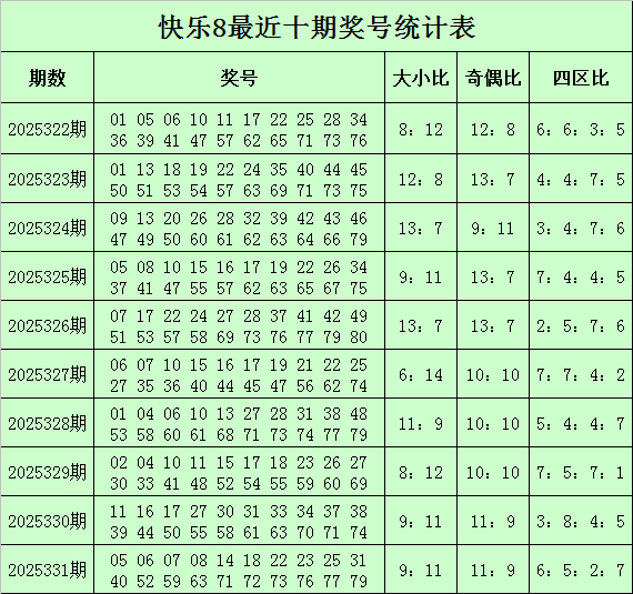 福彩精炼8第2025331期开奖回归:05 06 07 08 14 18 22 23 25 31 40 52 59 63 71 72 73 76 77 79,其中奖号四区比为6:5:2:7,奇偶比为11:9,大小比为9:11。