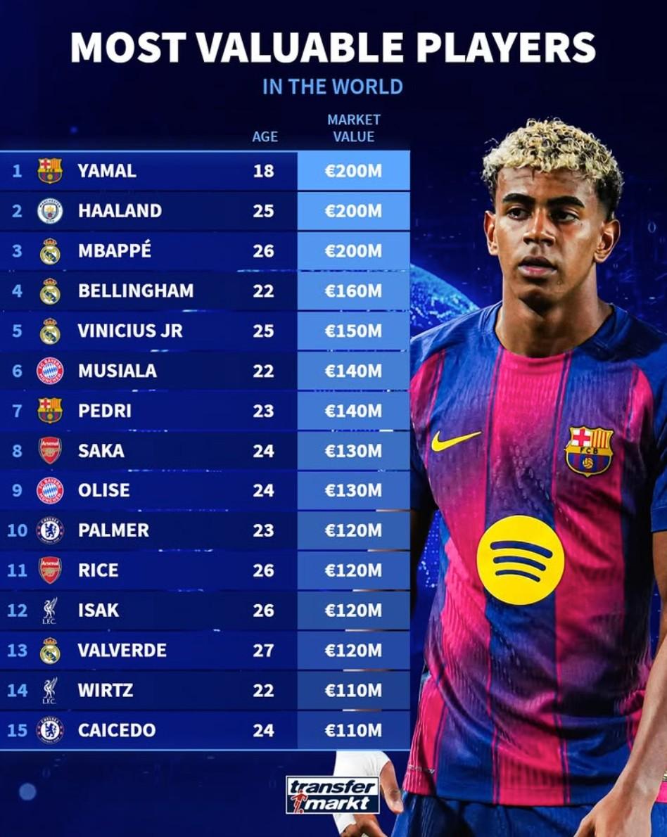 1. 亚马尔(巴塞罗那) 18岁 2亿欧元